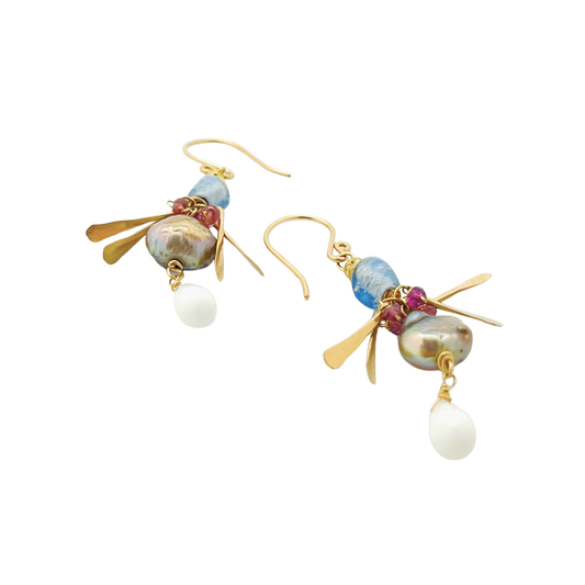 Garnet, Labradorite, Moonstone, Glass and Gold Leaf Earrings