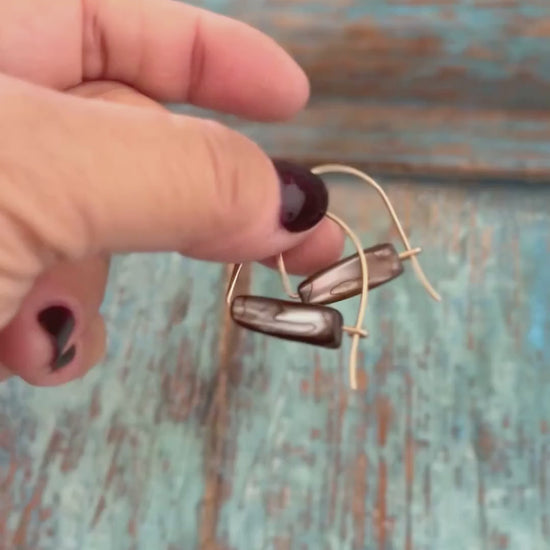 These delicate gold arc earrings showcase a triangular abalone shell nugget with a hammered texture on one side that catches the light beautifully. Handcrafted with care, each earring is uniquely shaped and hammered, highlighting the natural variations in color, form, and texture of the shell. Every pair is truly one of a kind.