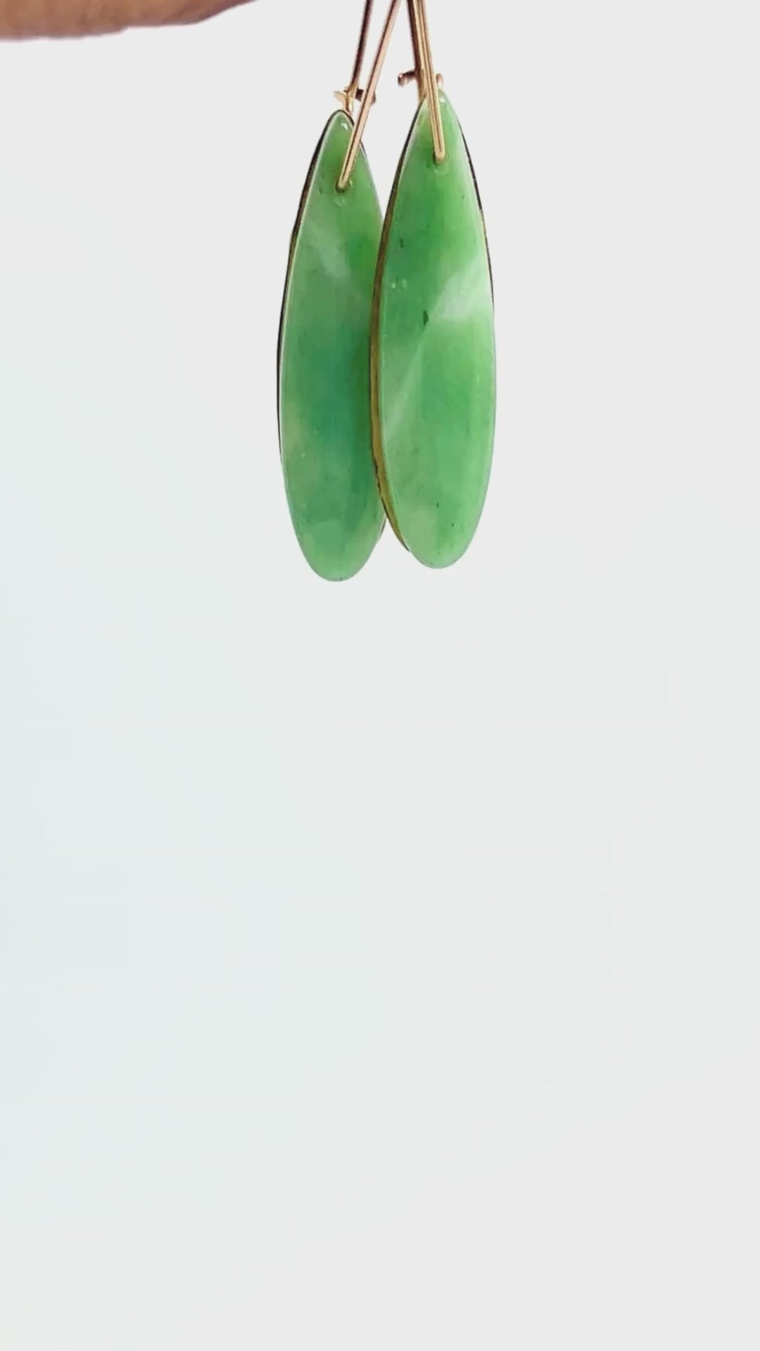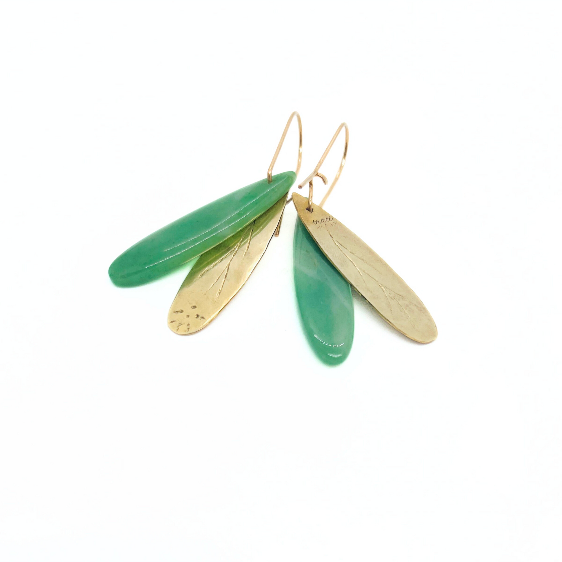 These drop earrings feature natural Brazilian Green Jade complemented by brass drops adorned with fine leaf engravings. Celebrated as a "lucky" stone, this jade is thought to attract abundance and support overall well-being.