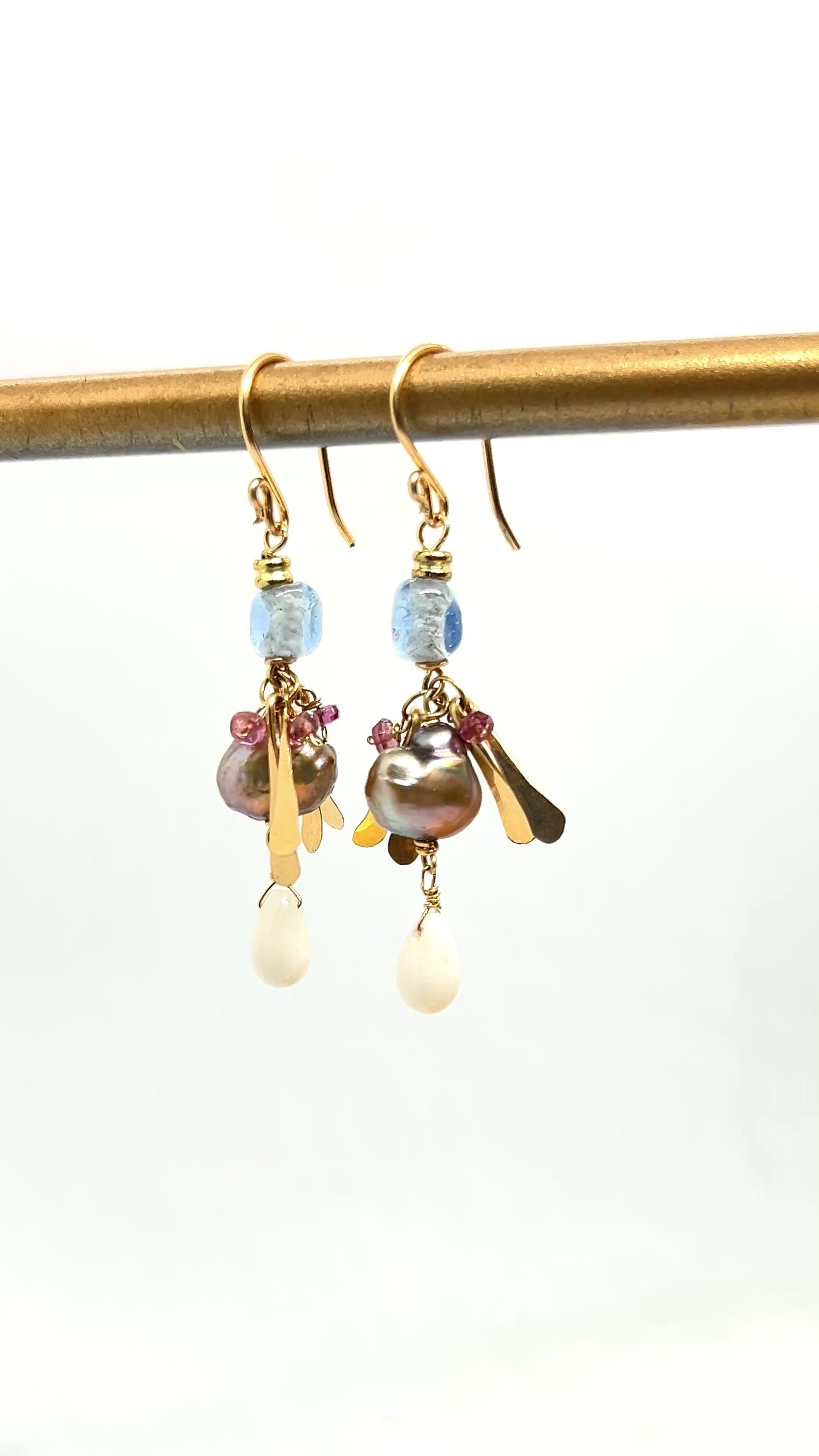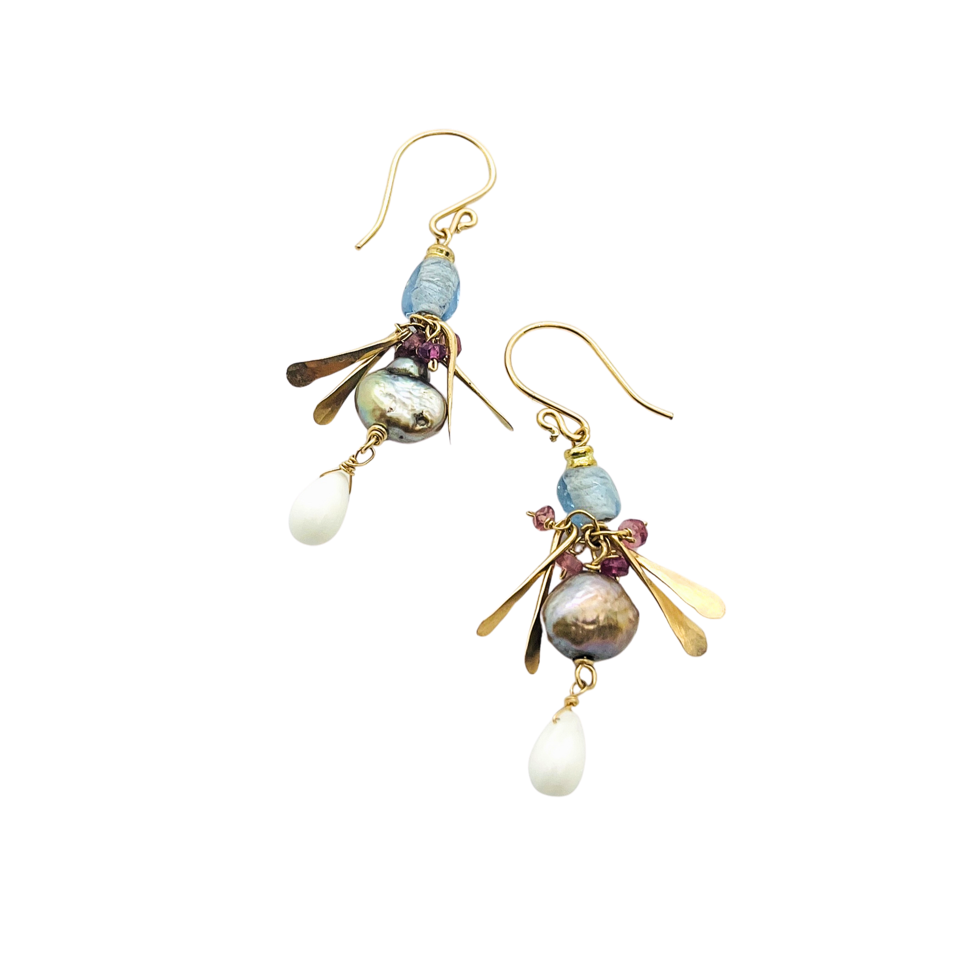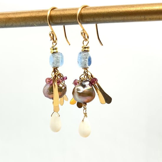 Gemstone drop earrings pairing freshwater pearl, african blue glass bead, faceted garnet, and a smooth coral drop with hand-hammered gold details. The faceted stones sparkle and pop in the light while the organic gold accents add graceful movement that remind me of the winged seeds falling from a maple tree.