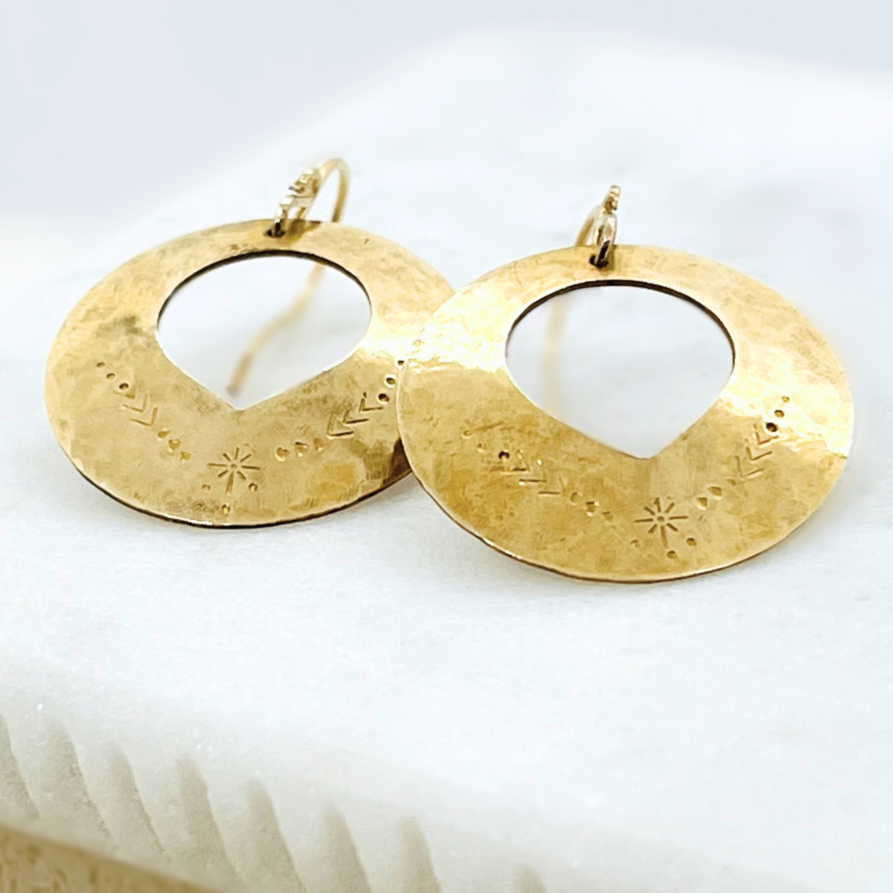 Handmade coin earrings with a lotus petal cut-out and stamped design, representing transformation and healing. Slightly domed for added dimension, each piece is individually cut, filed, stamped, and hammered for a shimmering textured finish.