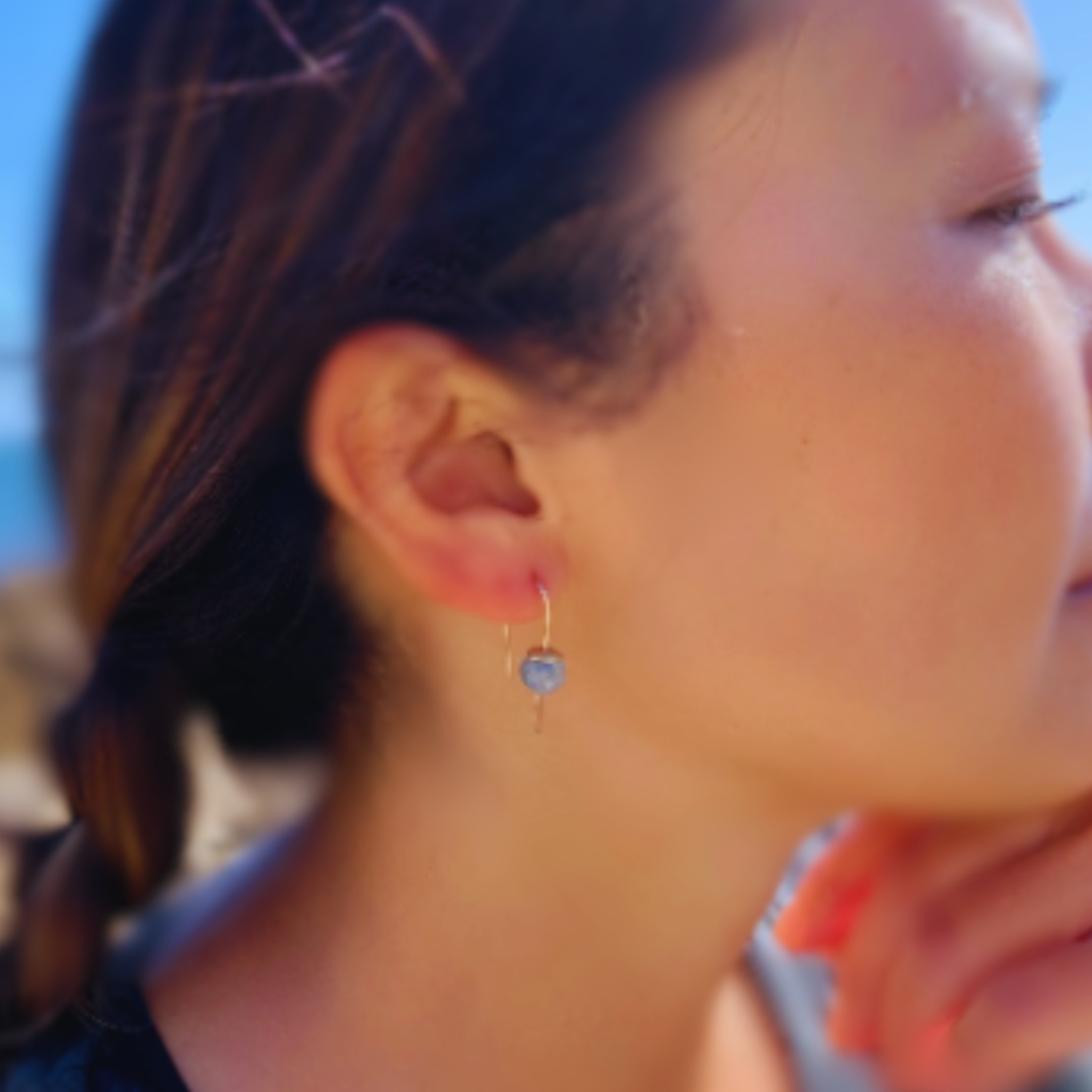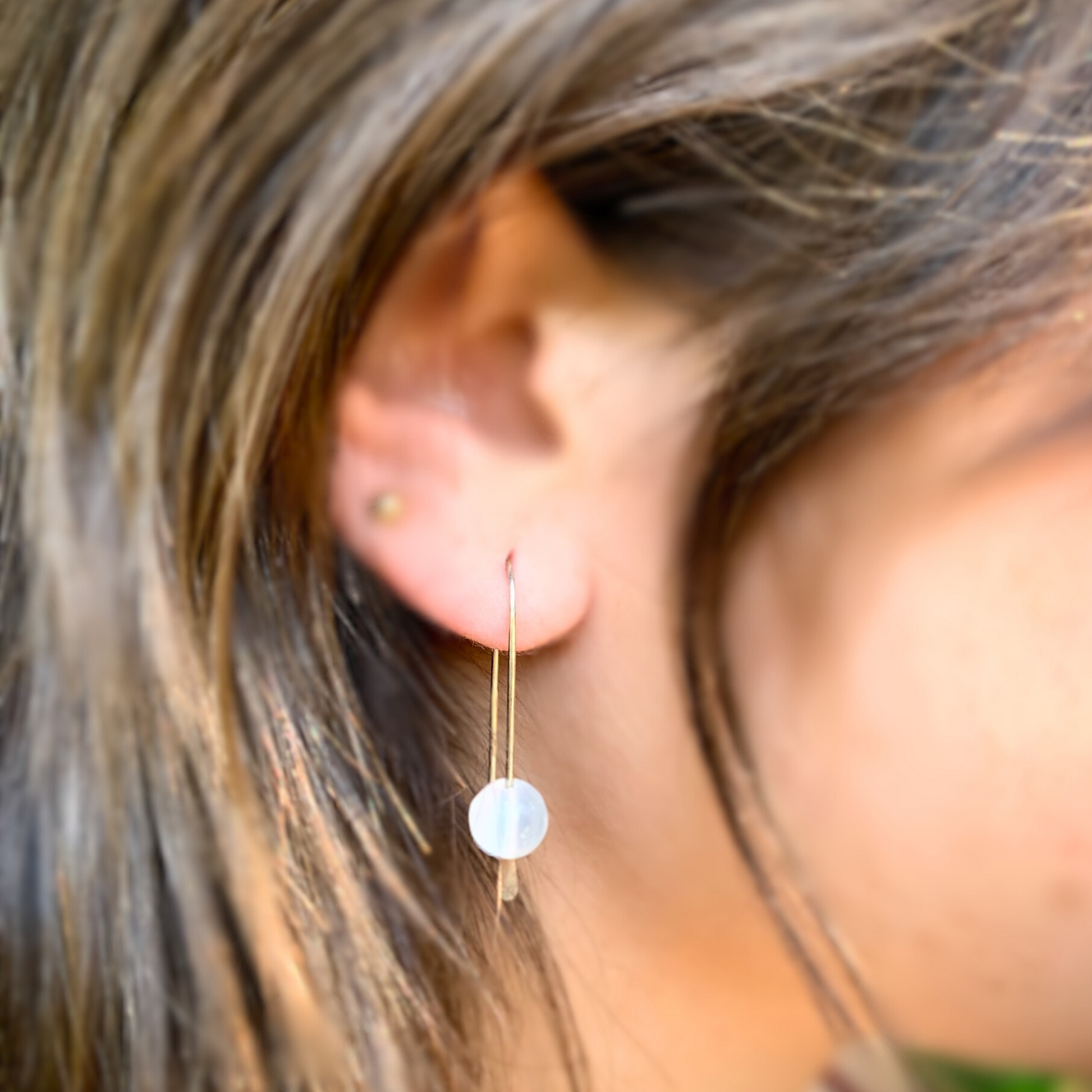 These delicate cascade earrings showcase a stone that is both gorgeous and therapeutic. The earrings have a hammered finial on a gold-filled ear wire, finished off with a smooth brass cap, making them easy to slip on and off and gentle on the ears. Hand-shaped and hand-hammered, each pair is unique.